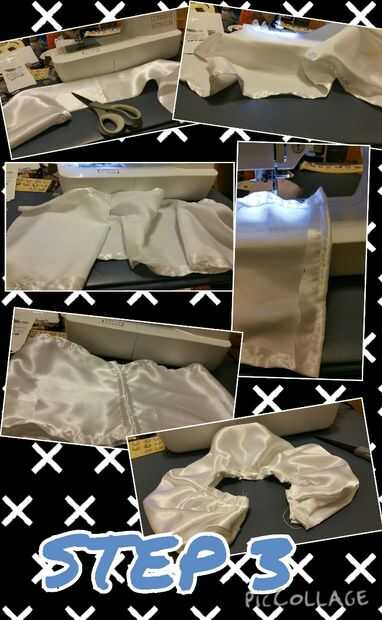 Ahora trabajamos en el ajuste de la máscara femenina. Utiliza un pedazo largo de 20 pulgadas de tela de satén blanco, recortar los bordes y coser un dobladillo en los 4 lados. Luego, una vez encerrado, doblado por la mitad, ubicado en los lados y cosido junto con un frunce plisado para obtener la pieza de colmena inflado que ves aparece. Luego, una vez tuve esta pieza me di cuenta era demasiado larga y no quiero cortarlo y volver a dobladillo, doblado por la mitad, y lo cosieron nuevo por lo que se convertiría en una fuller, doble ajuste de la colmena.