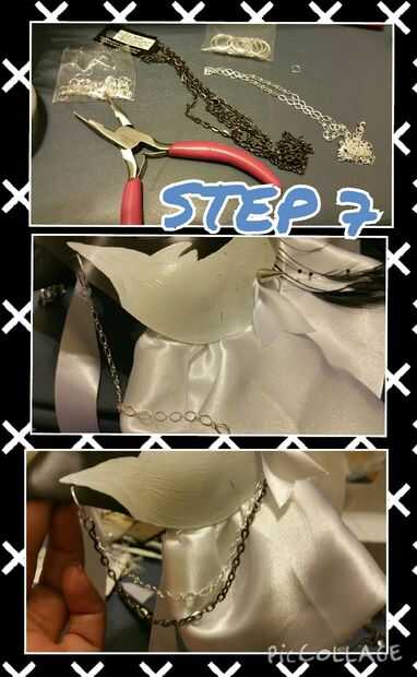 Ahora añadimos las cadenas de frío y picos de agujero de oído con los lazos de Satén atados a través de los oídos que se puede ver en la foto arriba y abajo. Elegí una hermosa, cadena fina de plata con una cadena de metal de arma. Medí cada pieza, dependiendo de cuánto quería que cuelgan contra la cara. He creado un agujero cerca de la nariz y usa el agujero de oído ya que las partes posterioras del lazo colgar las cadenas de.