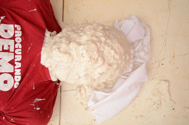 ¿Estás listo? Utilizar 1 litro de agua por la mitad un alginato de kilo, o 33 onzas agua para alginato de 17 oz. Vierta el agua con el alginato y empezar a mezclar con una cuchara. Comenzará a endurecerse cuando comience cambiando su color de rosa a blanco. Cuando esto ocurre, viértala sobre la cara de tu amigo, cuidado con las fosas nasales. Debe ser muy rápida, o el alginato se endurecerá. Si endurece antes de que usted vierte, no se puede utilizar ya, y debe comenzar otra vez la mezcla. Si usted vierte correctamente pero no puede llenar todas las partes de la cara, puede hacer más de la mezcla y vierta nuevamente en las partes que faltan.