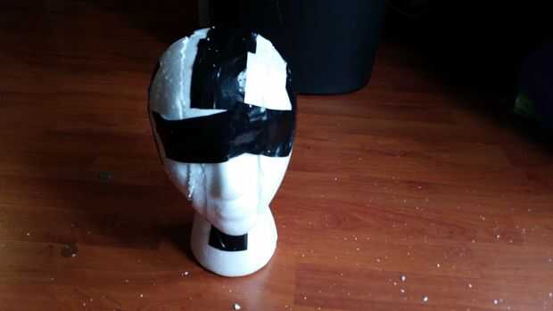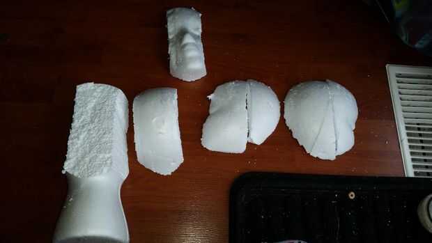 Cortar la cabeza de espuma de poliestireno en varios pedazos y usando cinta pato nuevamente juntos. Esto hará que easer para sacar el molde más adelante.