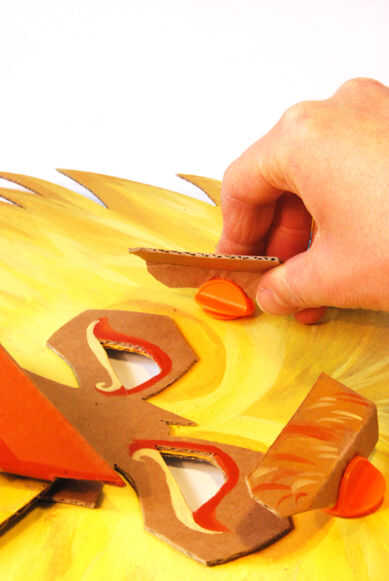 Usando el Makedo Scrus, coloque las cejas por encima de los ojos del León y los bigotes bajo la nariz.