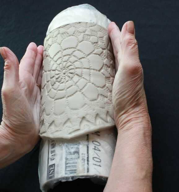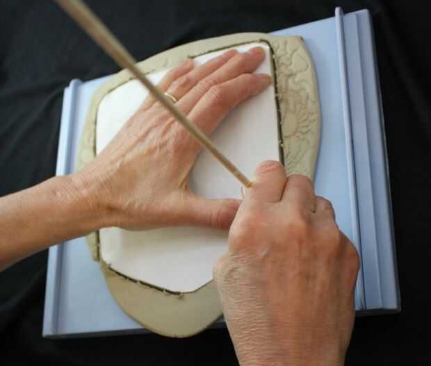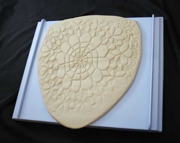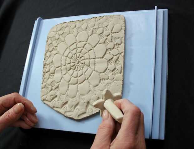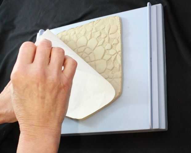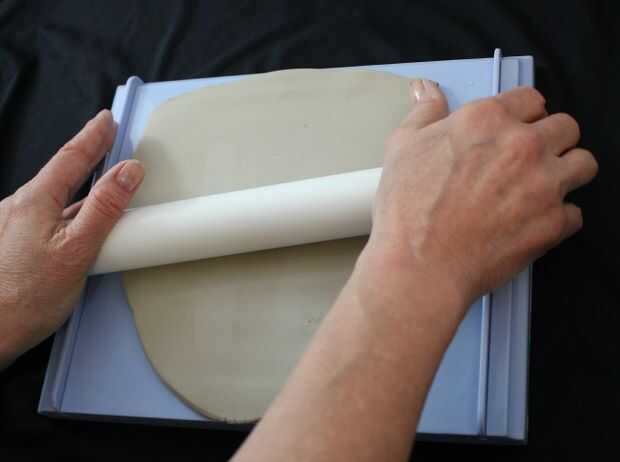 Utilice los listones de ¼" con el kit para rodar hacia fuera arcilla. Si el kit no está disponible usar palos de madera pintura y un rodillo. Asegúrese de utilizar siempre los listones con el perno de balanceo. Presione el cordón o textura en arcilla girando el pasador sobre el barro aún usando los listones. Hacer esto antes de cortar la forma. Corte la forma deseada con pincho y el lugar en forma de máscara.