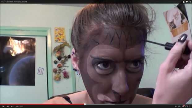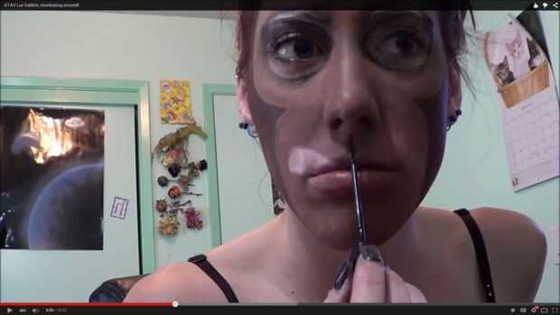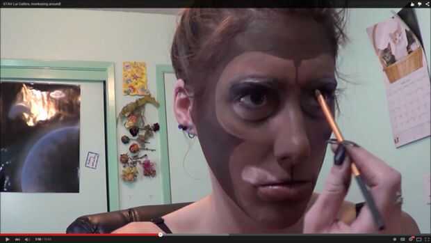 Agregar detalles como la boca, tirando algunos eyeliner de la parte inferior de la nariz a su labio. Tus cejas, que buscando un poco enojado y 'grandes'... luego añadir también mirando piel del marrón oscuro, la piel un poco falso parece de plumas.