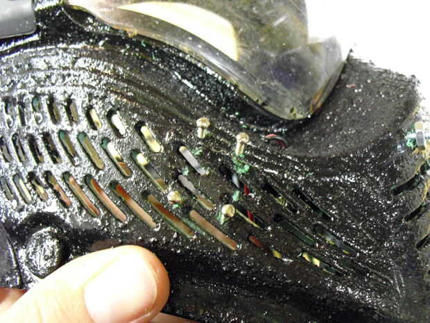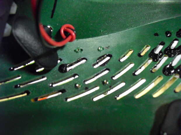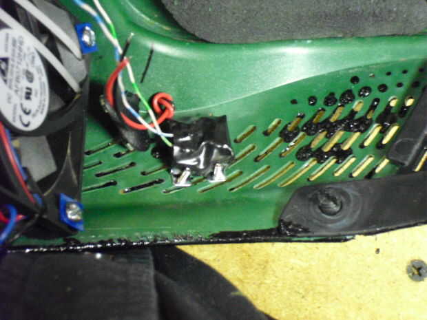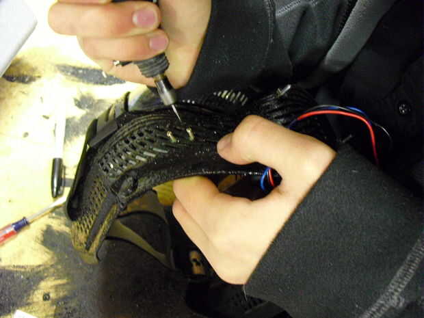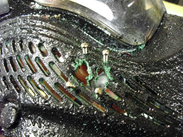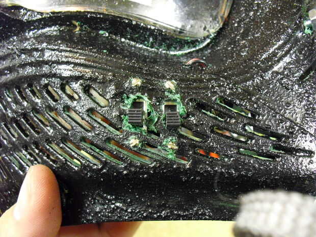 Posición del grupo a la derecha de donde la batería se encuentra (mirando el interior de la máscara). Perfore cuatro agujeros pequeños para tornillos y dos ranuras para el interruptor de los brazos. Asegure con tornillos con cables que van hacia el ventilador.