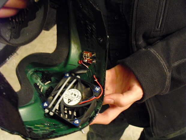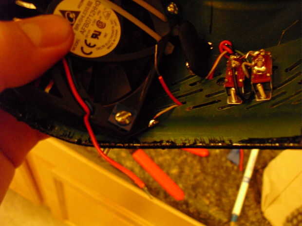 Soldadura la batería negro conducen a lo poste de centro del interruptor. Conecte el cable rojo al cable rojo del ventilador. Soldar los dos hilos restantes entre sí.