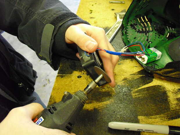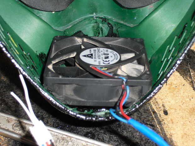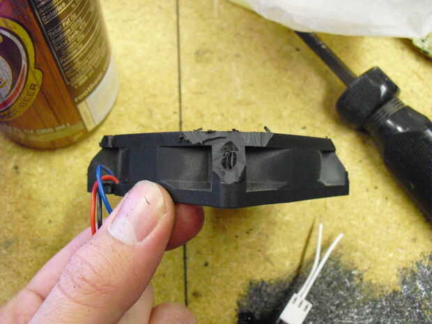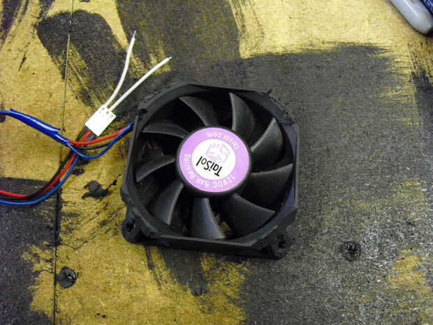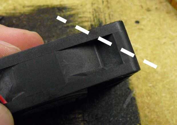 El siguiente paso es cortar las cuatro esquinas de la fan. Estas deben ser las esquinas hacia donde sería su rostro. Utilice el dremel con un accesorio de la rueda de corte. Usted puede limpiarlo con alguna lija si quieres pero esta parte no será visible después del montaje.