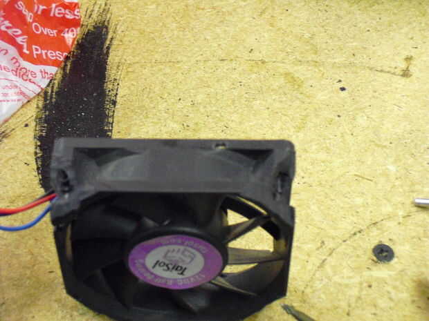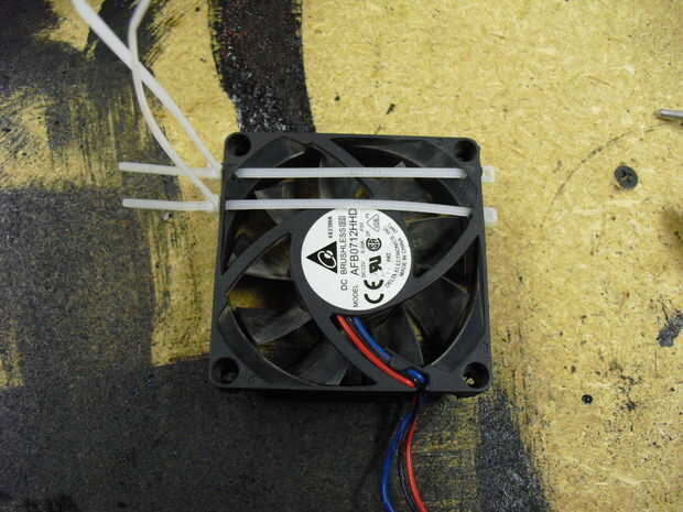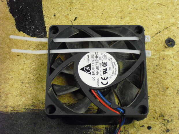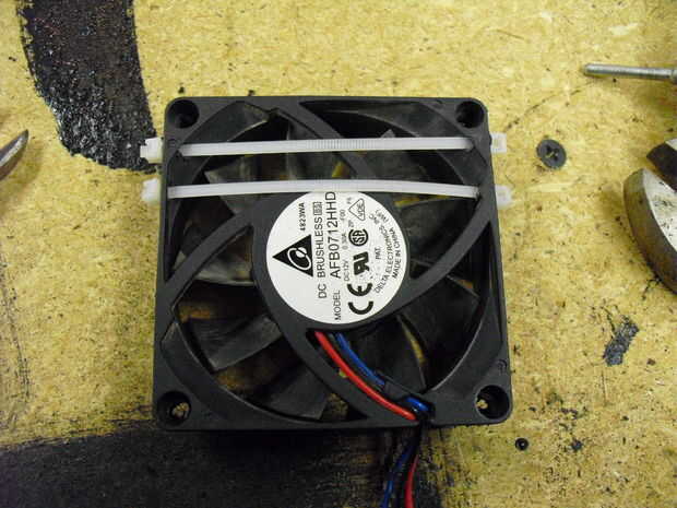 Ahora si no quiere esta cosa para comer tu cara mientras estés usando, usted probablemente querrá poner algún tipo de guardia en ella. Creo que hay disponibles comercialmente hecho unos pero zip lazos funcionan igual de bien. Perforé dos agujeros a cada lado de la parte superior del ventilador, donde mi mentón podría entrar en contacto. Luego dos abrazaderas de plástico por los orificios de había roscado y aseguró con el otro dos.