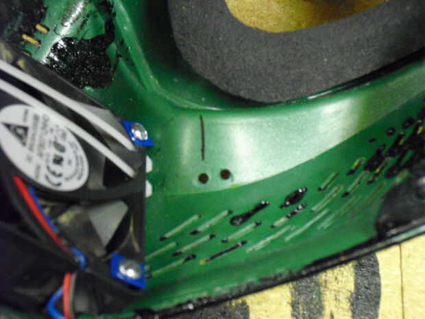 Taladre dos agujeros de lado a lado para colgar la batería. Conecte los cables a través del orificio izquierdo y parte posterior en a través del orificio derecho. Sujételo con un nudo.