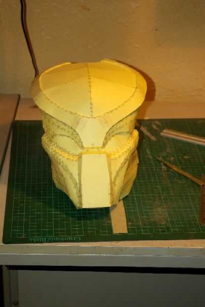 Muy incómodo y lento. Tardé dos tardes de trabajo sólido para producir el modelo de la tarjeta. Algunas no parecen tener bastante el contorno derecho comparado con los alambiques de la película que estaba usando como referencia. La papada parecía demasiado quemado hacia fuera. Finalmente pongo una tira de cinta adhesiva en la parte posterior para tirar la máscara en una mejor forma.
