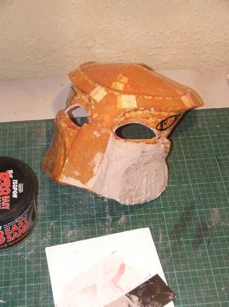 Una vez que estaba cubierto el 80% de la máscara, noté que los ojos eran un poco más grande y menos amenazante que la original. Altera su forma un poco con algunas inserciones de tarjeta cubiertos de masilla. Una vez estos sean suficientemente fuertes para soportar más esculpido y lijado.