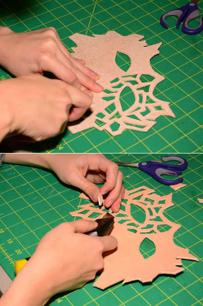 Después de haber creado el diseño entero sobre la piel, es hora de cortar! Esta es la parte más intrincada y desperdiciadora de tiempo de esta mascarilla específica pero te lo prometo, que el resultado final es que merece la pena! Comience por cortar el contorno entero de la máscara. A continuación, corte los agujeros de los ojos. Entonces empecé a cortar todas las áreas delicadas. CUIDADOSAMENTE corte en la línea del lado de la carne, luego voltee hacia el lado de grano (el lado liso) para extraer con cuidado las esquinas de cada uno de forma poco. No quieres sobrecorte en estas líneas, por lo que es lento va. Último en este paso, limpié hasta los bordes y las esquinas un poco mejor por lo que no hay filamentos finos colgando alrededor. Usted puede usar a un beveler borde en este punto para limpiar sus líneas y los bordes y añadir ese aspecto ligeramente angulado a los cortes. Me salté este paso porque me gusta un borde un poco y mis cortes eran tan pequeños, biselado no era ideal. Creo que después de todo la corte fue dicho y hecho, probablemente pasé unas dos horas en este paso porque decidí hacer muchas, formas de corte pequeño y de intrincado.