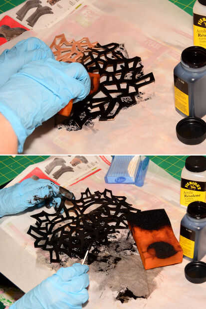En este punto, usted está listo para teñir su máscara de cuero con el color de su preferencia. He decidido hacer esta máscara negra, realmente me encanta este estilo en oro. Reúna su esponja, guantes y tinte. Proteger la superficie de trabajo con algún diario. Me gusta usar Q-Tips para los bordes y las esquinas muy estrechas. Aplique el tinte sobre uniformemente y suavemente sobre la parte delantera de la máscara, utilizar movimientos circulares para evitar golpes y cualquier tipo de roce o rayas del color. Cubre toda la fachada de la máscara, luego usando un q-Tip o un pincel pequeño, ir y cubrir los lados, bordes y esquinas que usted pudo haber faltado con la esponja grande. Deje que se seque completamente.