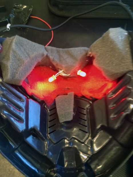 Para que no ciega a sí mismo mientras se está usando la máscara, poner un trozo pequeño de cinta aislante en un lado de cada LED y tiene ser el lado apuntando hacia su cara. También puede utilizar la cinta para mantener el LED en su lugar.