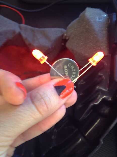 Conecte el LED a la batería de la moneda, ajustar su ángulo para que uno se pondrá sobre cada orificio del ojo. Puede que necesite un amigo para ayudarle a obtener la correcta colocación.