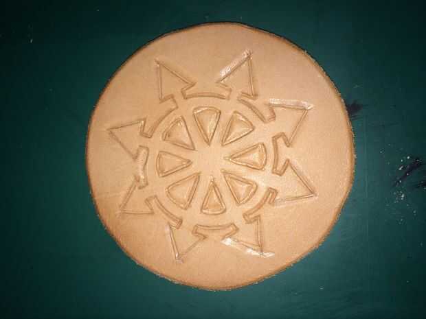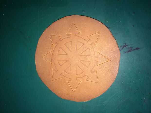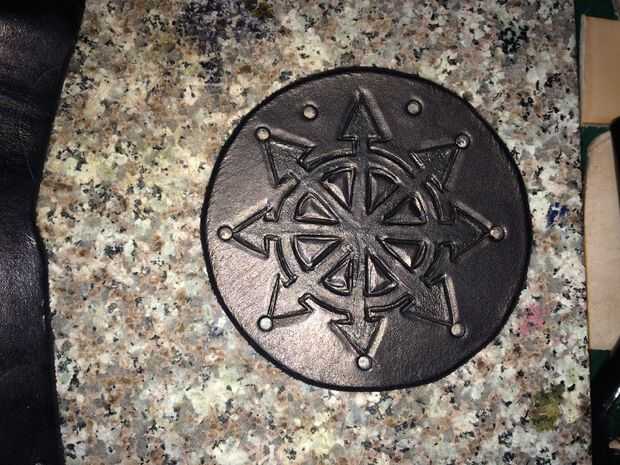 Cada máscara tiene una manera de asegurar a la cabeza. Éste no es diferente. La máscara original del programa utiliza un anillo de acero que sujetan las correas a. El anillo de Marcos un tatuaje en la cabeza de soldados que me pareció genial así que corte un disco de juego de cuero y funda el diseño de tatuaje en ella. La idea era que sería mucho más cómodo para usar y poder incorporar ese elemento del traje sin tener que dibujar en la parte posterior de la cabeza. Mancharon el disco negro de USMC y había perforado los agujeros donde se alinean las correas en el show.