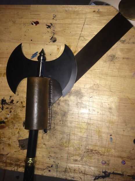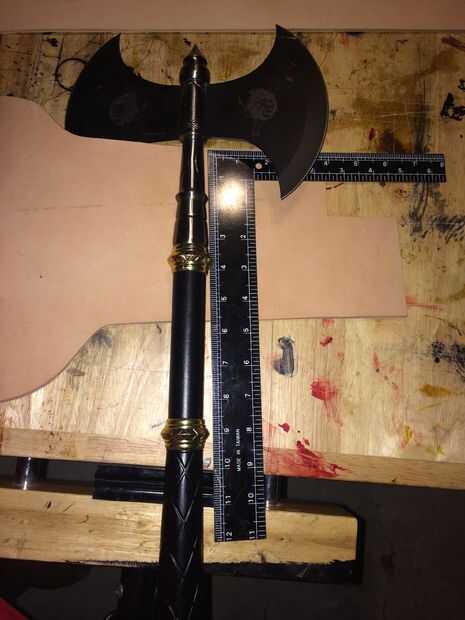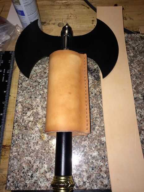 El traje viene con algunos accesorios así que quisiera incluir en este instructable para que pueda ver todo. Corté un panel 8 oz verdura curtida del cuero del zurriago aproximadamente 7 pulgadas altas y lo suficientemente anchos para formar un tubo alrededor de la parte más ancha de la manija, que resulta ser un pomo de trituradora de cráneo de 5 pulgadas. Cortar el panel de 9 pulgadas de ancho para tener extra para trabajar con si necesito (siempre es mejor tener más y no necesita que el que necesita más y no lo hecho de la vida. De nada). Yo había saturado el panel había formado alrededor algo de circunferencia comparable (en este caso un tubo de masilla) y dejar secar en lugar. Después de que en su mayoría estaba seca empecé a trabajar los bordes hasta un media pulgada del labio que luego utilizaría para coser los paneles de extensión de tahalí (cinturón de torso blanco que sostiene el sable). Mancharon la funda y correas con un Gel marrón antiguo que sella y protege así. La mano cosió las correas de extensión a la funda después de cortar una cuña de 45 grados el extremo para asegurarse de que la funda colgado directamente. A nadie le gusta una funda de hacha de batalla torcida. Después de que era una cuestión de guarnición hasta que la cinta termina con el cinturón en ángulos de 90 grados, marca 5 agujeros en cada correa y correa, los agujeros de perforación y Use remaches. Mentí. No utilizo remaches. Había cosida a la funda a las correas mediante un hilo de nylon encerado pesado en un punto ocho. Robusta, buena puntada. Si tienes más preguntas sobre este proceso sólo hacha me.