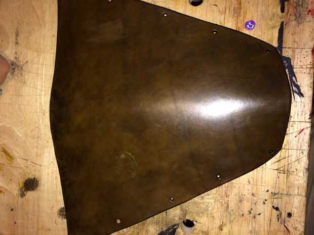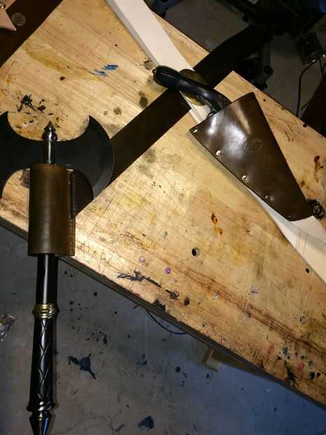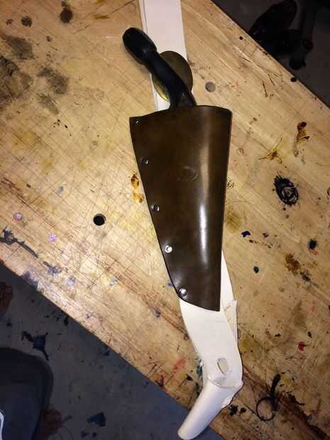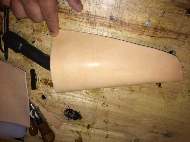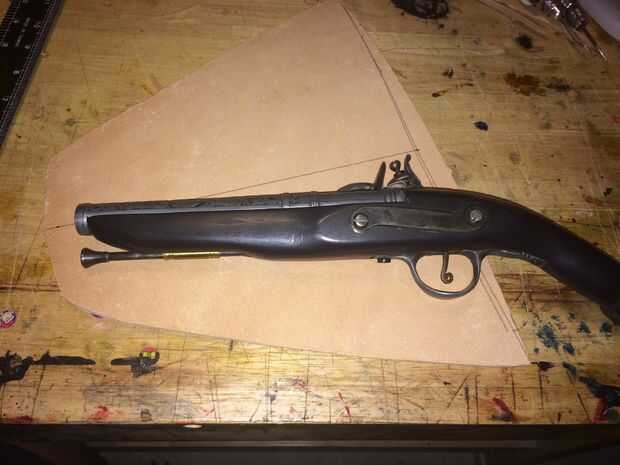 El traje de soldado del Hessian tiene también un flint-lock pistola así que decidimos hacer una sencilla funda para ella que se monta en el tahalí. Corté un panel de cuña de piel de vaca curtida de veg de 8 oz lo suficientemente grande para encerrar a todos los de la pistola con la excepción de la manija para un fácil drenaje. Dudo muy seriamente que se necesitaría para dibujar esta pistola en cualquier ocasión, pero por qué tomar ese tipo de oportunidad. Un pliegue sencillo demuestra que se adapta a la pistola. He manchado el cuero con el mismo Gel de marrón antiguo y pulir a alto brillo. Coloqué la funda en el tahalí de una manera que le permitió estar centrado izquierda y derecha y se sentó encima de la empuñadura del sable y debajo de la placa de latón. Es mejor marcar estos puntos de referencia mientras la persona está usando la correa para que sepa exactamente donde todo se encuentra y exactamente cómo cuelga en su cuerpo. Una vez que la funda se centraba yo perforar 2 orificios parte superior y 2 en la parte inferior de la funda por el tahalí y 4 remaches para sujetar firmemente. Después de fue una simple cuestión de perforar unos agujeros muy espaciados a los lados y unos remaches para cerrar el negocio. Después de era una sola pieza sólida de kit que contiene la funda de sable, hacha de batalla y cerradura de pedernal.