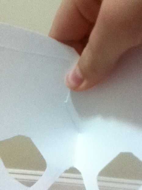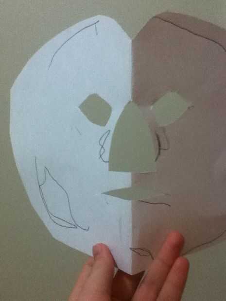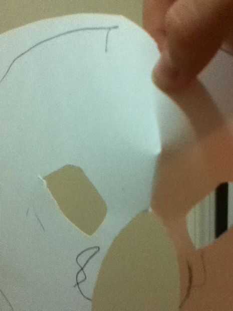 Cortar los ojos en la cartulina y cortar una pequeña ranura en la parte superior en el medio. No cortar la nariz y la boca como lo hice, quise llevar. Entonces donde usted corta en la parte superior, grapas o cinta juntos para que cree un ángulo.
