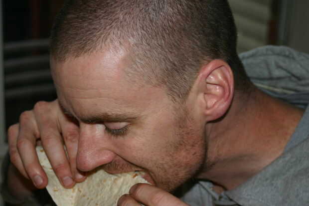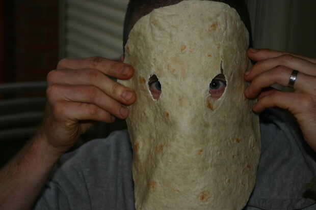 Doble la tortilla encima de las manchas de los ojos y utiliza su boca hambrienta llena de dientes a Ensenada los orificios para los ojos.  Puede hacer simples agujeros redondos o ser creativo y hacer ojo en forma, triángulo, cuadrado o lo que sea en forma de agujeros que desee.