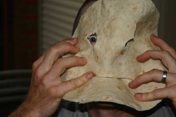 Este paso es incluso más fácil que hacer los ojos.  Mientras sostiene la tortilla, con los agujeros de los ojos alineada con tus ojos, empuje la tortilla en la boca y la mordida.  Al igual que los ojos, puede hacer la boca simple o ser creativo.