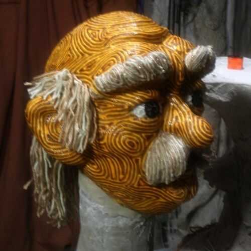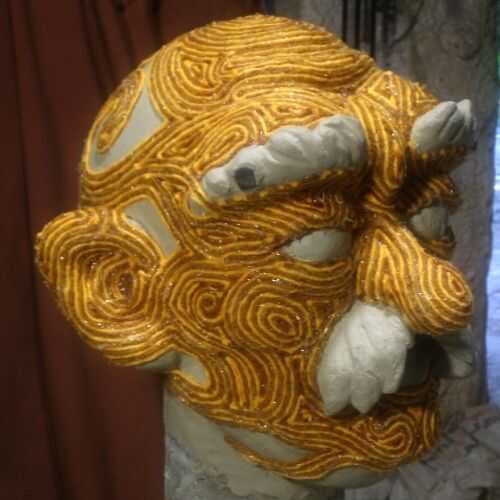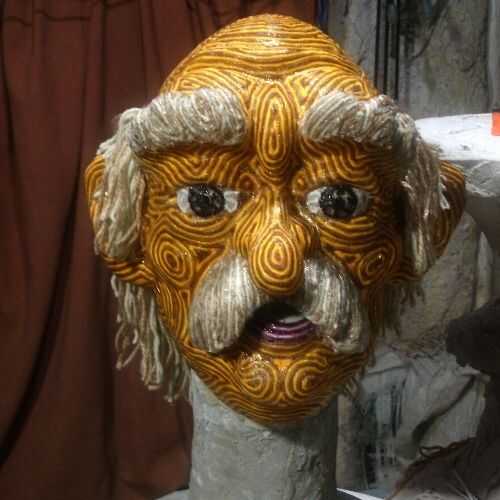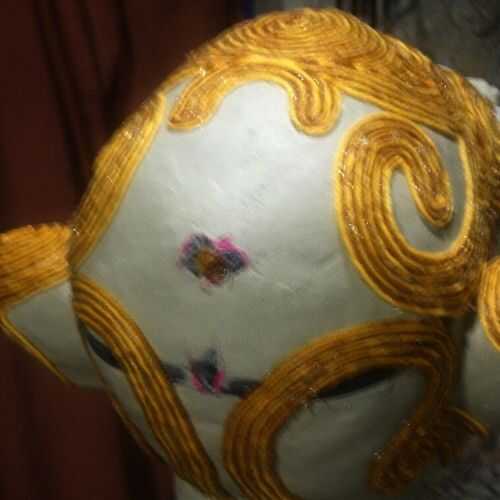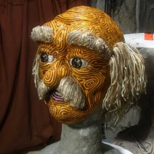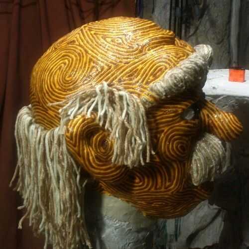 Pegamento caliente del derretimiento e hilo permanecerá en su lugar en la tierra batida mientras que la superficie está cubierta, pero ya que la capa superior de arcilla puede levantar sólo una capa de polvo, la capa de pegamento no se pega firmemente. Ningún agente desmoldante es necesario para obtener la máscara del molde más adelante. Hice un par de recortes detrás de los oídos para ayudar a conseguir la máscara del molde. Cabe en mi cabeza la misma manera que salió del molde, y las aberturas detrás de las orejas son apenas sensibles.