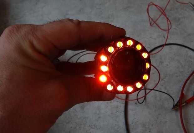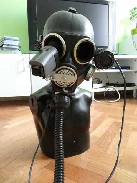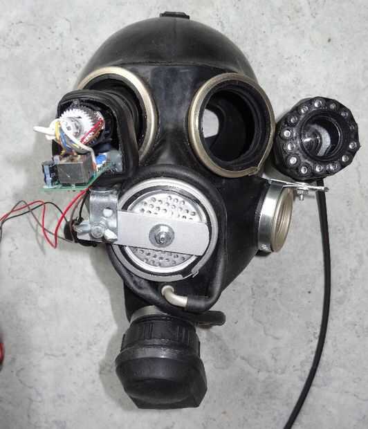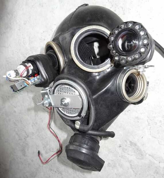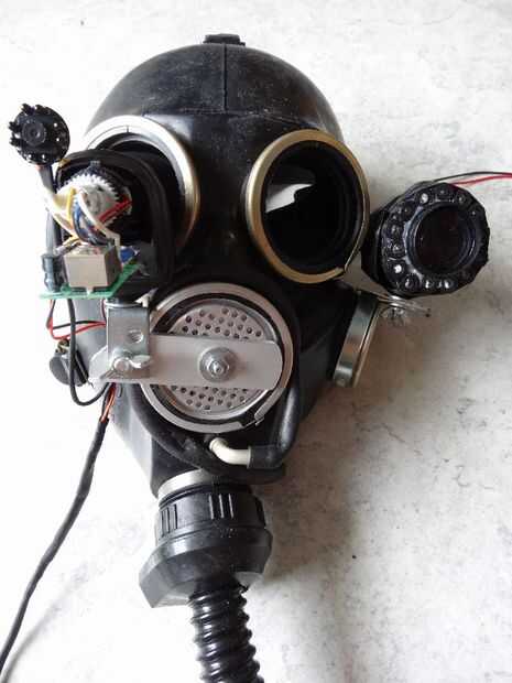 Pero la máscara no está aún terminada. Tanto piezas como sea posible me clued algunos LED naranja alrededor de la lente de la cámara desmontada y fijo en el otro lado de la máscara. Luego metido un tubo utilizado generalmente para pequeños estanques y bombas en la pieza de la boca de la máscara de gas. Para comunicarse con los otros luchadores que usar una óptica-fibra-toy de mi hija. Para aumentar la intensidad de la luz infrarroja montara más IR-LED en el frente.