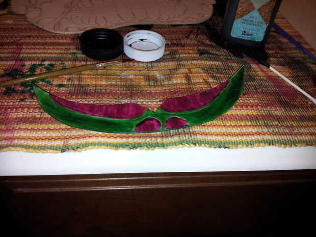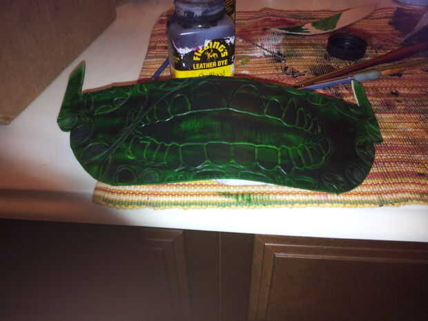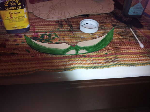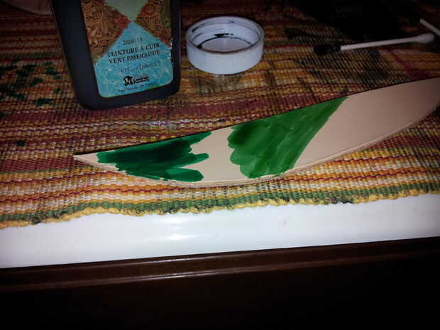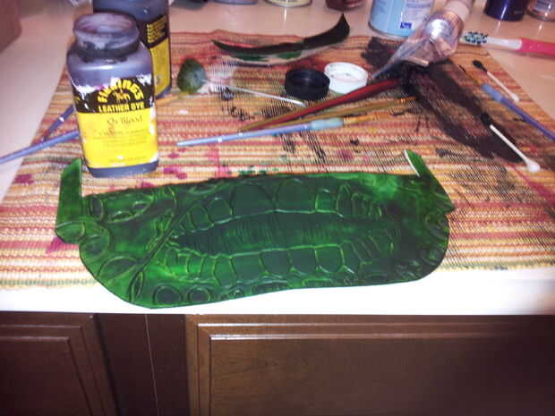 No se olvide de probar sus tintes en una probeta de cuero para asegurarse de que tienes el color que desee. puede utilizar colores diferentes con la carne y el músculo pero preferí todo ser verde entonces tomé un trapo de la tienda y pulir el cuero teñido.
