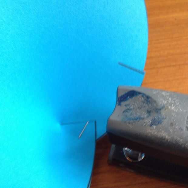 Este siguiente es un poco incómodo. Sobre los bordes de vuelta en el corte en la parte superior y les de la grapa juntos, repetir este proceso para todos los cortes. Nota: puede que desee asegurarse de que las grapas van desde el interior de la máscara hacia fuera como serán menos propensos a enredar en el pelo.