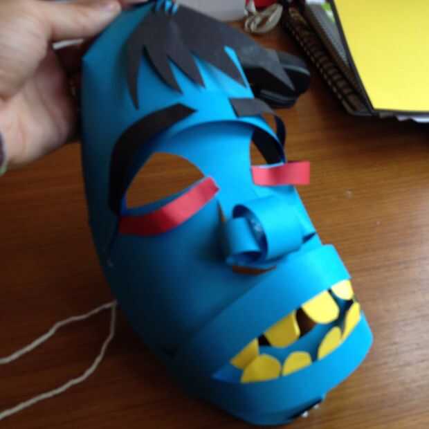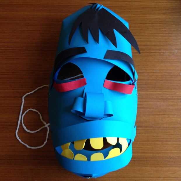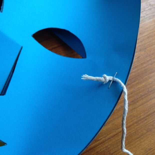 Tomar el extremo anudado de la cuerda y la grapa en el lugar en el interior de la máscara asegurándose de que el nudo está detrás de la grapa (y que el elemento básico va desde el interior de la máscara hacia fuera)