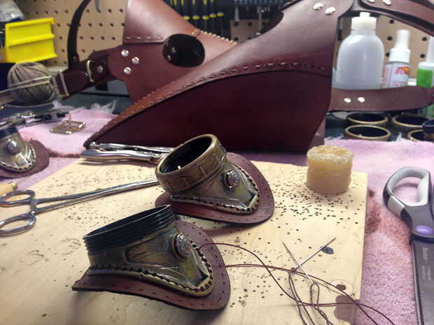 A continuación las gafas fueron cosidas a los anillos de cuero con un hilo más ligero de peso marrón encerada. La Asamblea de anteojos todo entonces se sutura a la máscara con el mismo hilo encerado este como el resto de la máscara.