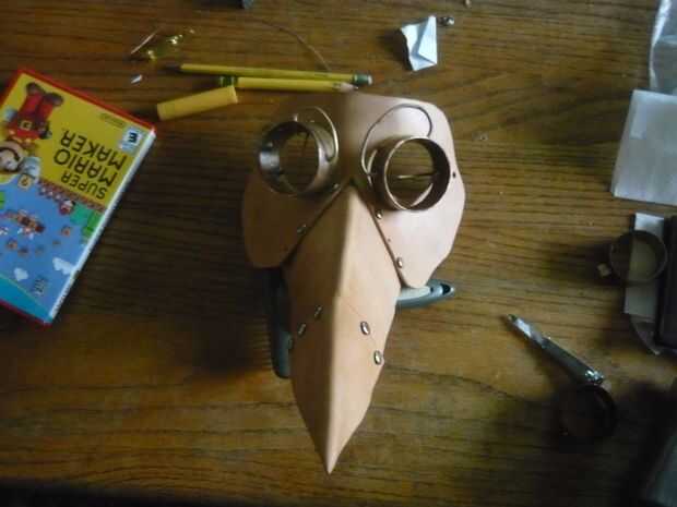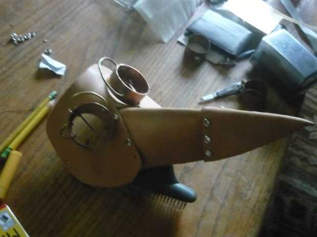 Tomar las piezas de la máscara y conseguirlos mojado (agua a temperatura ambiente está muy bien). La pieza debe estar húmeda pero no empapada. Sólo conseguir mojado hasta el punto que se convierte en fácilmente maleable pero no flojo. Asegúrese de obtener la piel curvada para el pico. Doblar por la mitad y luego estirarla hasta conseguir un buen pico curvado. Para la parte de la cara, manténgalo hasta tu propia cara (o la cara de la persona para usarlo) y la piel alrededor de él prestando mucha atención al puente de la nariz. Perfore agujeros en una de las piezas para ser unido por remaches. Sujete la segunda pieza para ser clavado hasta la primera y marque los orificios con una herramienta de puntuación. El sistema que empareja de los agujeros del sacador y repita el procedimiento en otras articulaciones. Inserte el más grande de las piezas de dos remaches en cada agujero y ver si alinean. Si no lo hacen, sólo estirar la piel hasta que. Si quieres gafas, introdúzcalos ahora mientras todavía puede cortar o estirar la piel para que encajen. Si va a dejar las gafas durante un largo periodo de tiempo (noche), dejar las gafas en para evitar que el cuero se reducir a medida que se seca.