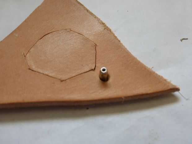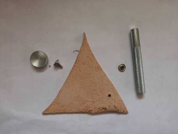 Cuando se haya secado el tinte y el acabado de comenzar a clavar. En realidad, la práctica, entonces comience clavando. Bien tan remachado no es realmente tan difícil pero inténtelo unos tiempo en algunos desechos de cuero antes de remache de la máscara. También puede calentar los remaches (fuego!!!!!!) para conseguir un aspecto agradable, sin brillo. Tenga en cuenta que esto eliminará una capa de los remaches, haciéndolos más susceptibles a la roya. Inserte la pieza más larga del remache hacia arriba a través de la parte inferior de ambas piezas de cuero. La tapa se encaja a presión en bastante fácilmente. Poner la pieza de remache inferior sobre el lado redondeado del yunque del remache (taza de metal mirar algo) y sostener la pieza redonda del compositor del remache (palillo de metal, cosa de golpe) a la parte superior del remache. Golpee el setter del remache con un martillo de madera hasta que el remache es bastante cómodo en la piel. Repita con otros remaches. Probablemente usted querrá hacer esto sobre el borde de una mesa para obtener el remache yunque bajo el cuero. Recuerde que el orden es remache de yunque, remache largo, cuero, cuero, remache cap, remache setter, martillo. Yo también clavado en del velcro, correa tenía puesta alrededor pero cadena funcionaría igual de bien.