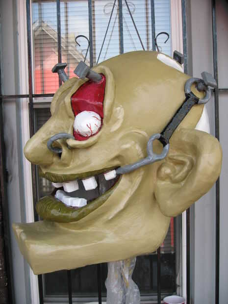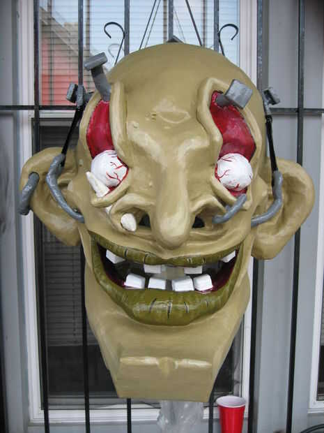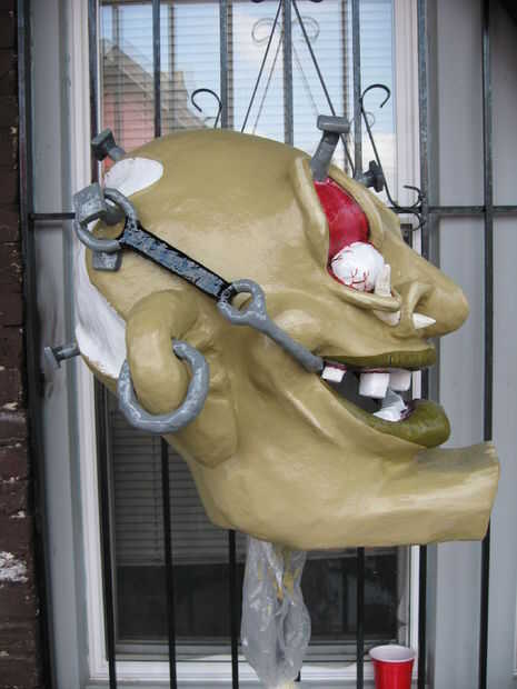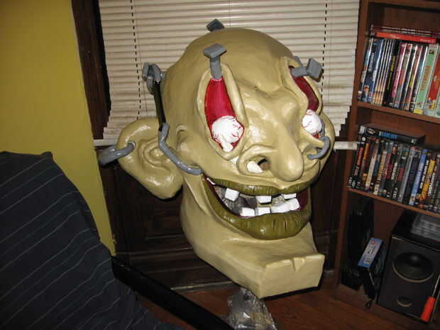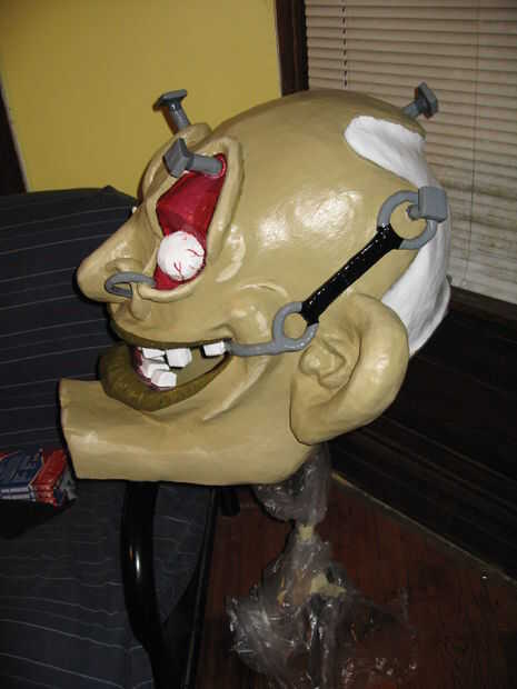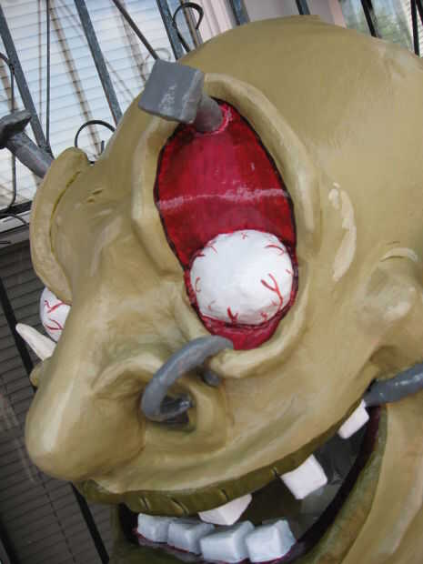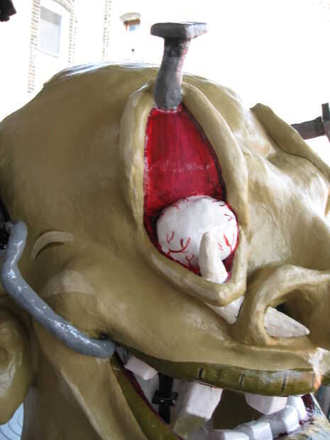 El escandaloso rojo de los párpados internos fue el resultado de pintar con un viejo cuarto sobrante de housepaint había llamado "pastel de cerezas", luego que superponer con un rojo primario y a través de veteado con blanco. Las venas en los globos oculares son el mismo esquema de color, y las encías en la boca son sólo tres capas de pastel de cereza. Yummy.