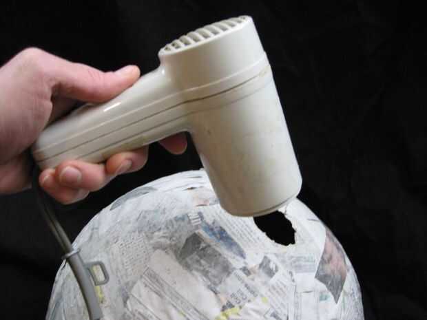 Cuando esté listo, tome una aguja y reventar el globo, dejando la cáscara. Me gusta tomar un secador de pelo en el interior, porque a menudo todavía hay algunos húmedo allí. Luego, corte una abertura grande en un extremo para hacer un agujero para la cabeza, y ahora estás listo para empezar a trabajar en la buena parte!