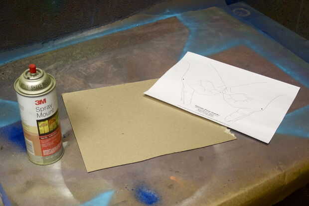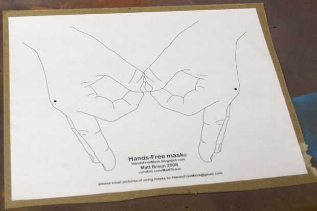 Tomar la impresión de la máscara y Monte a un pedazo de cartón (no corrugado)!. He utilizado un trozo de aglomerado y spray de montaje. Un panel de una caja de cereal funciona bien y palillo del pegamento también funciona bien para la plantilla de la máscara a la cartulina.