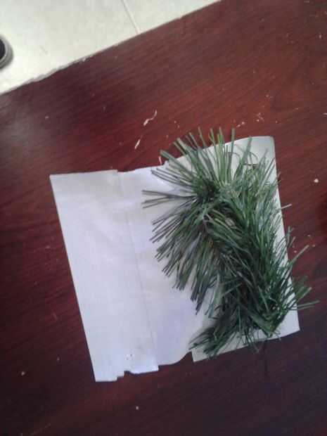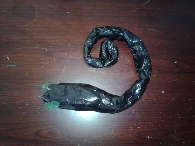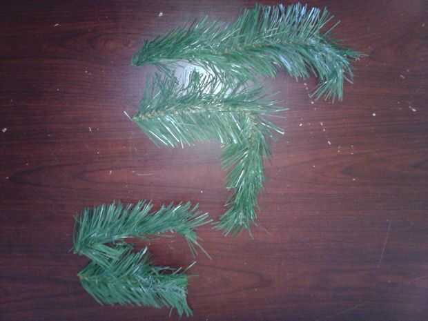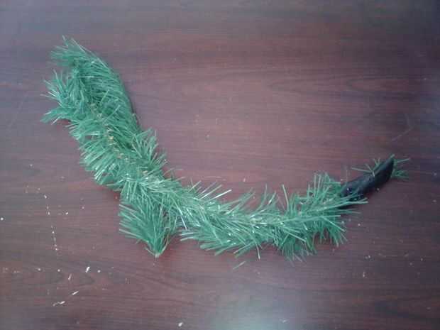 Tome un pedazo de 4 pies de garland, plegar en secciones de 2 1/2, ver foto. Envuelva con cinta aislante fijamente el extremo más delgado y trabajando hacia el extremo más grueso. Completamente se envuelva en cinta. Tomar el extremo pequeño y toda la obra del enrollamiento en espiral. Ponga a un lado.