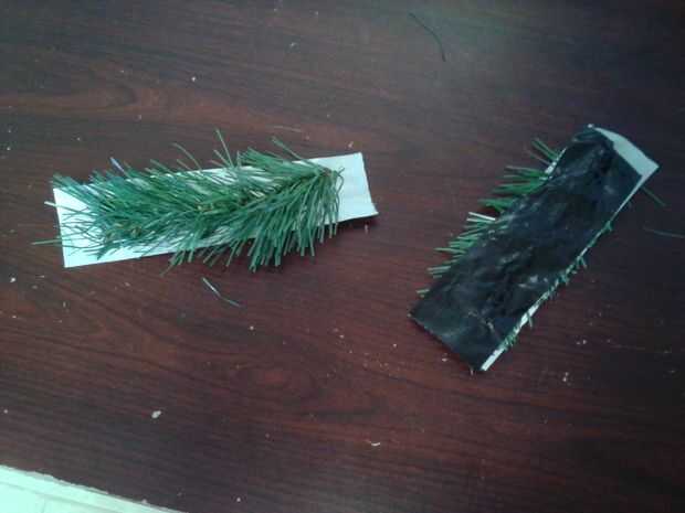 Tomar un trozo de guirnalda de 6 pulgadas, coloque una tira de 6 pulgadas de la cinta en él. Coloque el lado pegajoso hacia arriba en mesa. Coloque una tira de 6 pulgadas de la cinta en él. Presione los bordes para sellar. Bordes cortados con tijeras de forma redondean las esquinas de la parte inferior. Ponga a un lado.