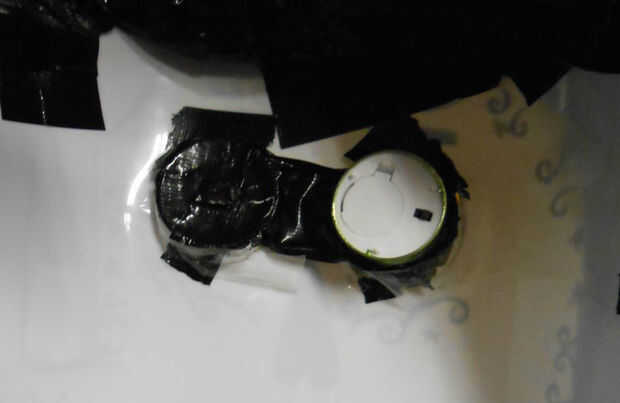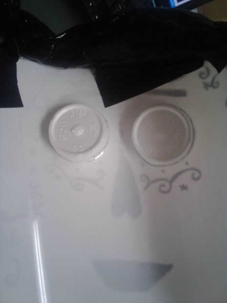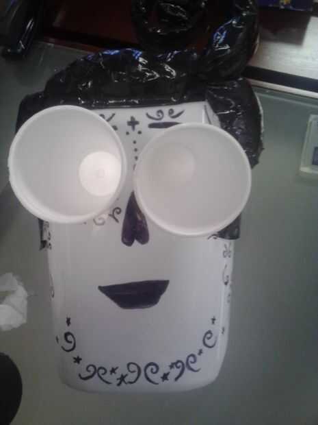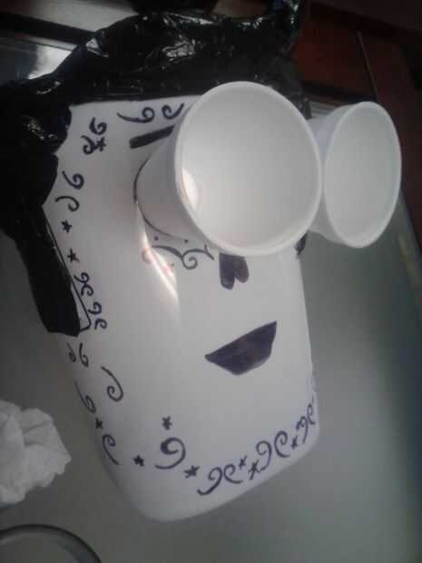 Coloque las tazas de poliestireno en los agujeros del ojo. Fije en la parte posterior con cinta adhesiva. En el frente, cortar el exceso de las tazas con el cuchillo. Marcar el centro de los ojos con el cuchillo. Utilice el negro pintura en los ojos. Déjelo secar. Utilice un bolígrafo o un lápiz para abrir el centro anotado.