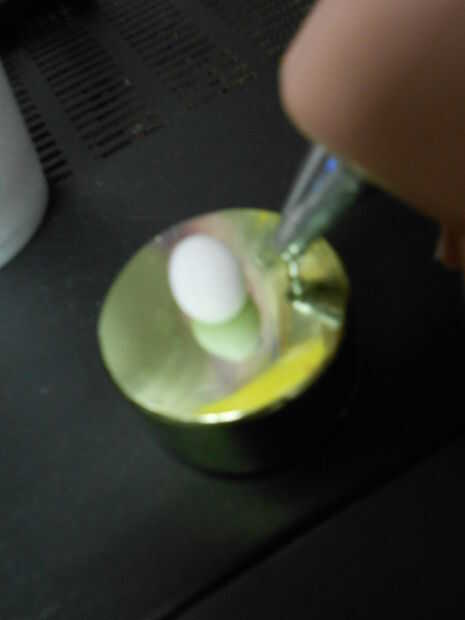 Con la pistola de pegamento, poner pegamento alrededor del bulbo de la candelita. Inserte la candelita en la parte posterior del ojo, deja enfriar. Repita en el otro ojo.