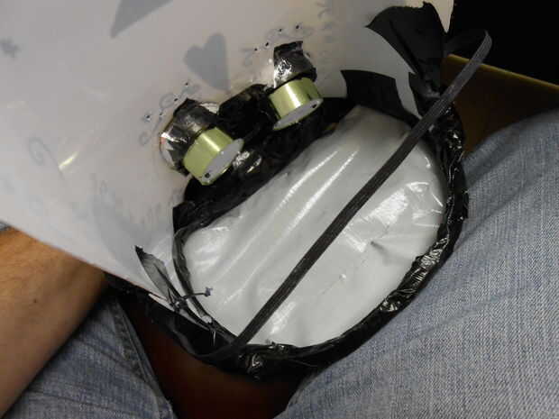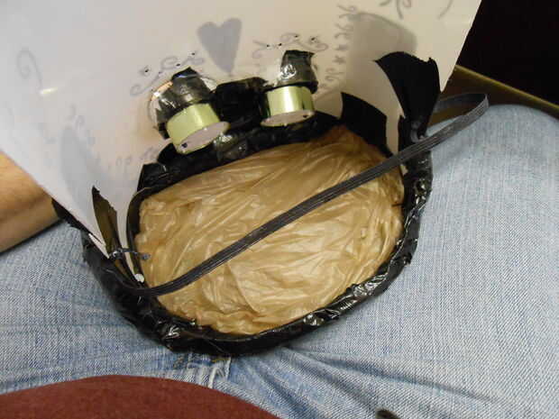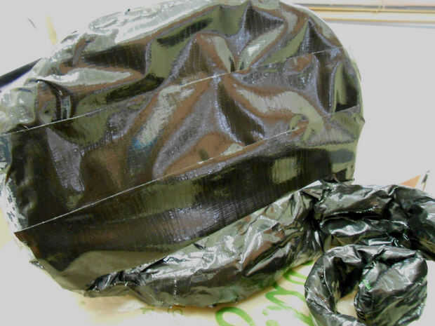 Terminar el la parte superior de la máscara colocando unas tiras en la parte superior para completar el cabello. Coloque una bolsa de plástico doblada en el interior. Esto cubre el lado adhesivo de la cinta y dar más volumen en la parte superior.