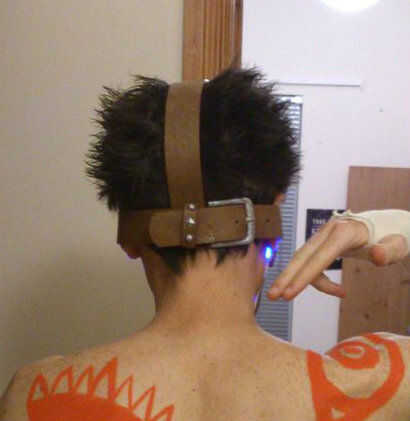 La banda vertical no es necesario para mantener la máscara conectada pero es en el juego y cada poco ayuda. La segunda banda fue cortada como antes pero esta vez que se utilizó la sección media. Probar la máscara para obtener la longitud correcta pero la pega de correa de cuero en el interior de la parte superior y en la parte posterior de la correa horizontal sin la hebilla. En la foto arriba para hacer más sentido.