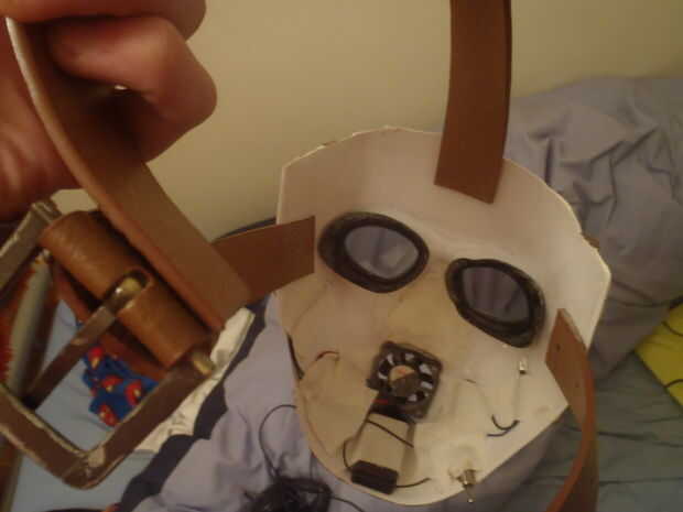 Para la banda horizontal, que forma el sujetador, la sección media de una correa fue cortar y desechar: dejando dos largos, con los agujeros y el otro con la hebilla. Los extremos cortados estaban pegados en el interior de la máscara, de aproximadamente una pulgada en para asegurar resistencia; Es el cinturón que llevarán a cabo la máscara para que tenga mucho abuso. He encontrado una vez estuviera pegado que mi máscara era demasiado flojo para que perforó un agujero de la correa nueva. La máscara debe ahora permanecer en manos libres! En este momento corrí alrededor de la casa jugando "psycho" antes de pasar.
