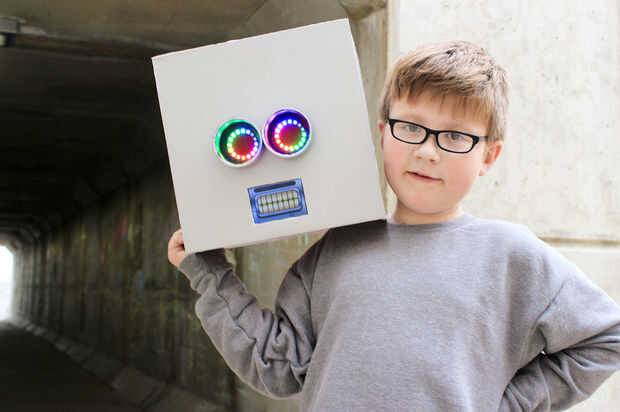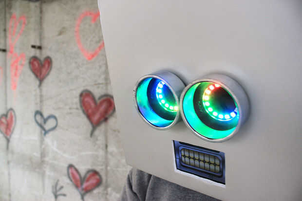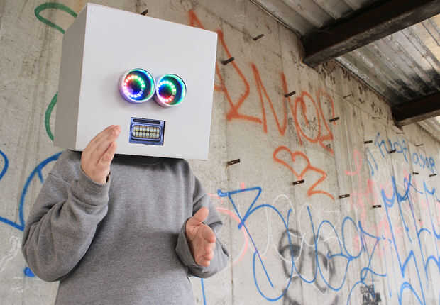 Este año para Halloween, hemos decidido hacer una mascara de robot para nuestro hijo mayor. Hay unos pocos componentes electrónicos diferentes que trabajan juntos para realizar la máscara final. Se utilizaron anillos neopixel y un arduino para el control de los ojos, un iPhone viejo trabajado como la boca, y aparte hicimos un juguete del cambiador de voz barato para agregar más diversión.