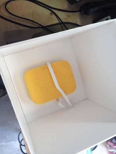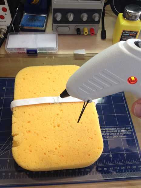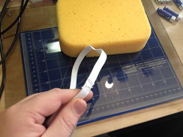 Una vez que lo tenía todo montado y secado, tomé un azulejo de esponja (cualquier espuma adecuada funcionaría bien) y caliente lo pegado al techo de la máscara junto con una longitud de elástico. Esto amortiguar la cabeza de mis hijos y mantener la máscara en su lugar mientras él está usando. Lo hizo salir al garaje y probarlo en tamaño sólo para asegurarse que lo necesario antes de cualquier otro. Siguiente