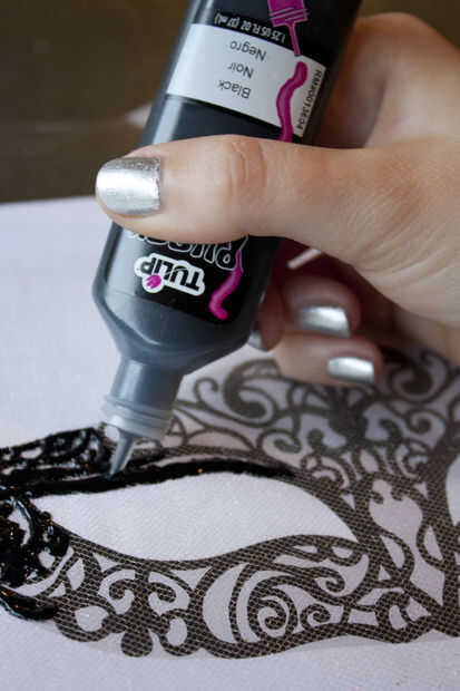 Asegúrese de que todo se graba hacia abajo firmemente y empezar a remontar la parte negra de la plantilla con pintura de tela. Deje que se seque durante la noche.  Suavemente Retire tul de abrigo de saran.