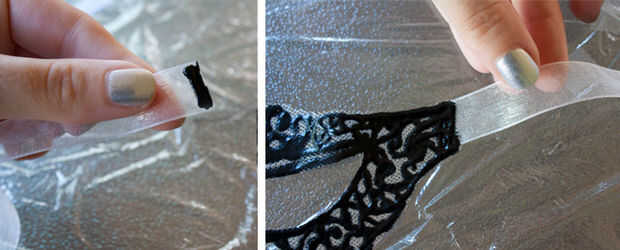 Corte dos trozos de cinta de 20 cada uno. Extiende un poco tela de pegamento en las puntas y sujete a la máscara. Dejar seco 1-2 horas. (Usted puede recortar las hebras más cortas si quieres, sólo asegúrese de que atará alrededor de su cabeza antes de cortar!)
