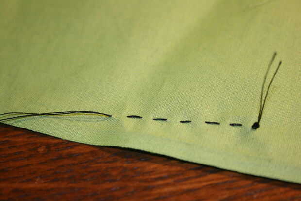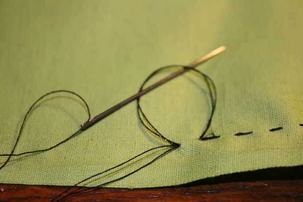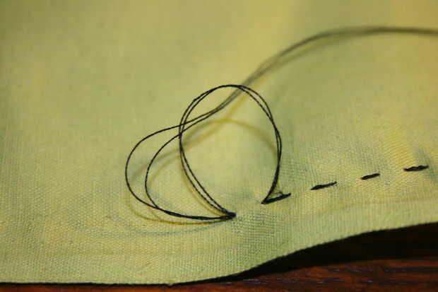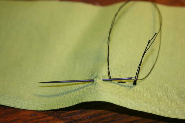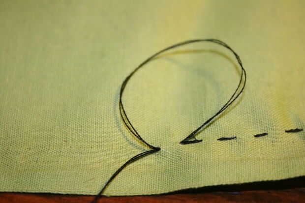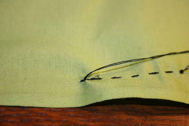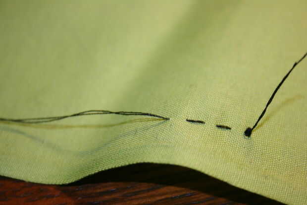 Si el tejido es lo suficientemente delgado como para manejar una puntada incluso puede que sea más fácil y rápido para penetrar la aguja a través de ambos puntos en la línea al mismo tiempo. Si está seguro de que podría incluso golpea varios puntos a lo largo de la línea a la vez.