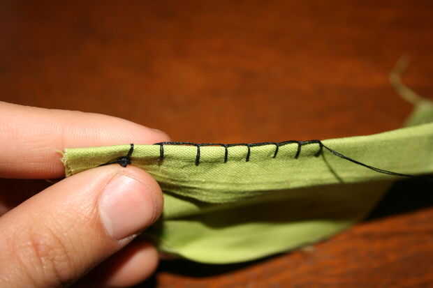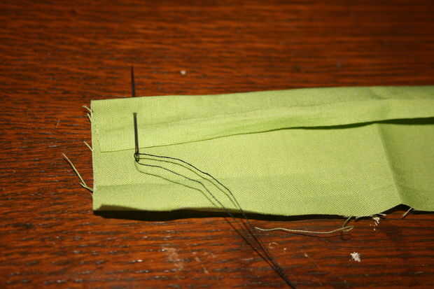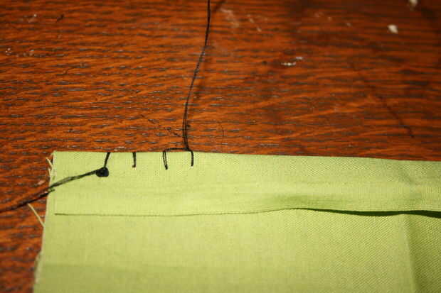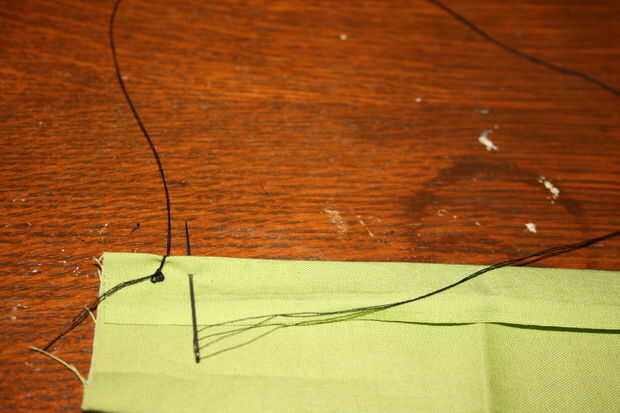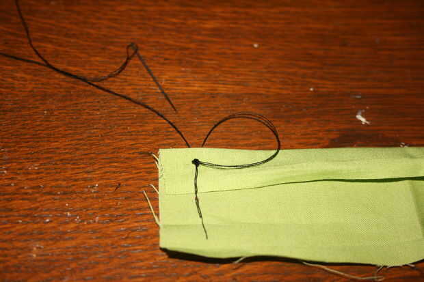 Ya que estamos usando a una tela más fina, empezar doblando el borde que desea terminar. Para comenzar la puntada, pinchazo de la aguja a través de dos capas una corta distancia hacia abajo de la tapa y tire del hilo a través de todo el camino. Para este primer punto, poner la aguja en el pliegue y enviarlo a través, donde inició, en la misma dirección. Esto debe formar un bucle de hilo alrededor del borde doblado. Esta vez, alimentan la aguja a través de este bucle de hilo antes de tirarlo tenso.
