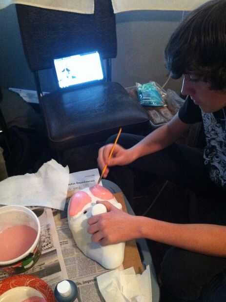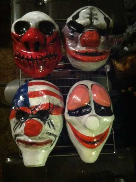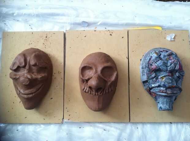 Diferentes niveles de progreso... Uso de papel maché para crear la máscara. una vez que se formó, habían liberado de las formas de arcilla. Utilizamos elásticos para garantizar las máscaras, pero causó demasiada compresión a los lados de papier-mâché. Como se estira el elástico, hacer los lados querer contraer hacia dentro, así que dio un par de capas de resina de fibra de vidrio (no de fibra de vidrio, sólo la resina) para que sean más rígidos. Pintar los detalles y agregar un lavado de acrílico negro muy diluido a la pátina, había traído hacia fuera los detalles y les dio un aspecto más siniestro. El último paso era una capa transparente de esmalte spray.