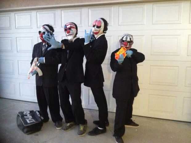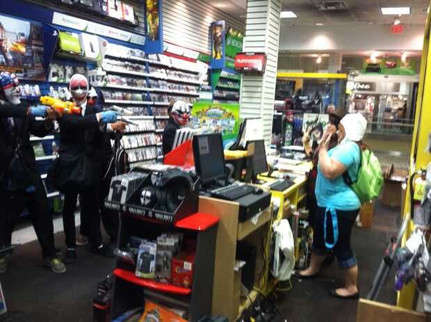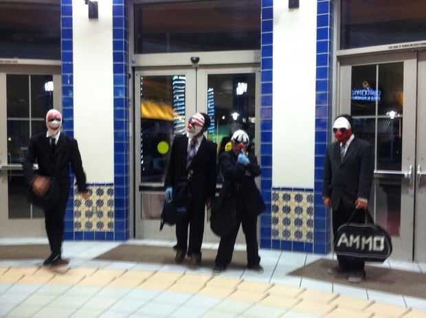 Guantes de látex azul, trajes y corbatas. Ya que esta es imitando a un juego de simulación de robo de banco, nos fuimos con las menos armas realistas, que no inventadas como real, a cualquier distancia. Nos fuimos al centro comercial a tomar fotos y dejar de jugar al juego era un buen deporte, posando para fotos.